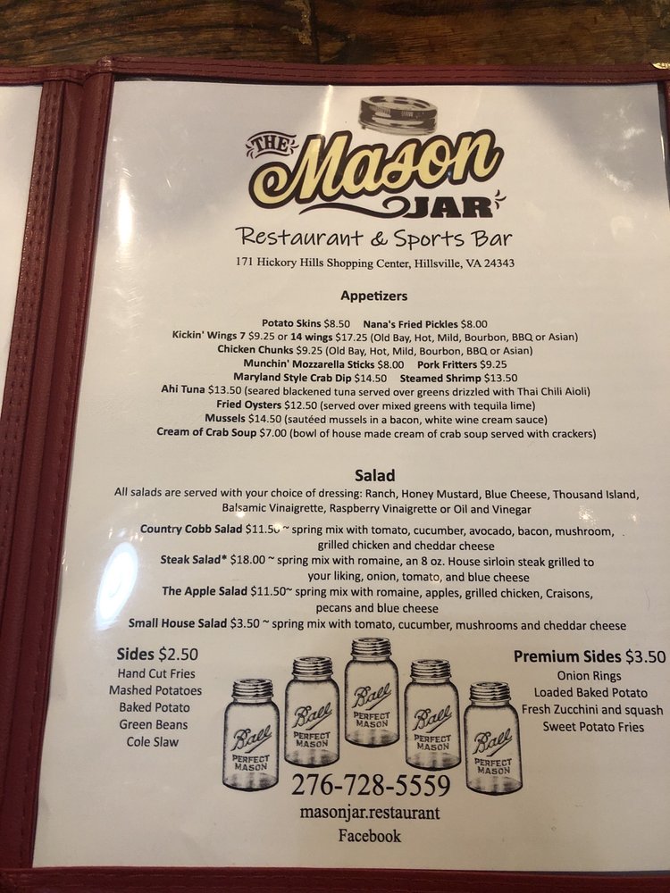 The Mason Jar, a sports bar and restaurant located in Hillsville, VA, offers a diverse menu ranging from salads to sandwiches. This casual yet vibrant spot provides a range of amenities, including takeout, reservations, delivery, and catering services. Customers have praised the flavorful dishes, such as the Marylander crab cake sandwich and bourbon-glazed burger, highlighting the generous portions and attentive service. With a full bar, live music, and outdoor seating, The Mason Jar creates a lively and enjoyable dining experience. Whether stopping by for lunch with the family or grabbing drinks with friends, this establishment caters to a variety of preferences. The well-seasoned hush puppies and extensive salad options, like the pecan apple salad and Cobb salad, are standout choices that leave diners satisfied. Overall, The Mason Jar provides a welcoming atmosphere for a delicious meal and good company.